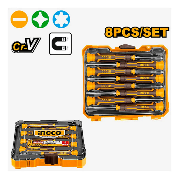 Caja de plástico Incluye: SL2.0x50, SL2.5x50, SL3.0x50 PH00x50, PH000x50, PH0x50, T6x50, T8x50 - Material: CR-V -Mango de agarre cómodo.