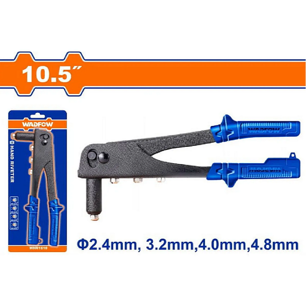 REMACHADORA MANUAL POP WADFOW WHR1610 Fabricadas en chapa de hierro laminada en frío con terminación en pintura epoxi. – Mordazas fabricadas en Acero Cr-Molibdeno. – Incluye 4 boquillas métricas y pulgadas intercambiables para remaches de acero y aluminio: 2,4 mm. – 3/32 3,2 mm. – 1/8 4 mm. – 5/32 4,8 mm. – 3/16 – Incluye llave para intercambio de boquillas. – Mango ergonómico inyectado en PVC.