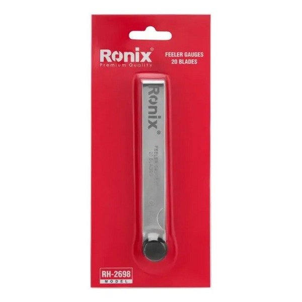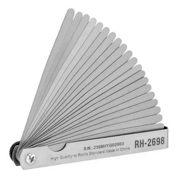 El juego de galgas de espesores Ronix RH-2698 incluye 20 hojas de acero al carbono 65Mn, con distintos espesores que van desde 0.05 mm hasta 1.00 mm.
